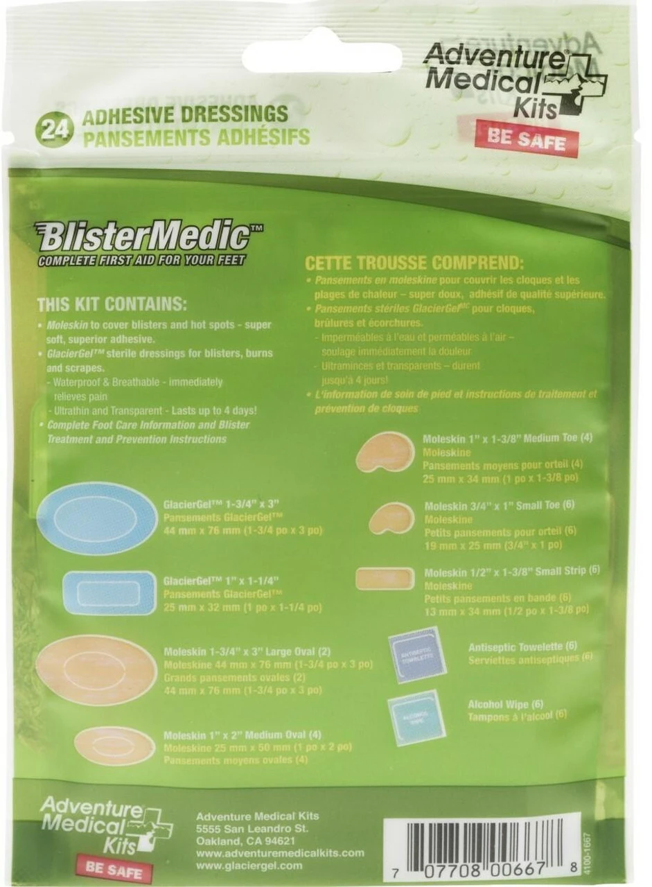 The Adventure Medical Kits Blister Medic Kit combines blister protection and prevention of Moleskin with Glacier Gel hydrogel dressings. Alcohol pads for skin preparation and antiseptic towelettes for wound cleaning round out the package.