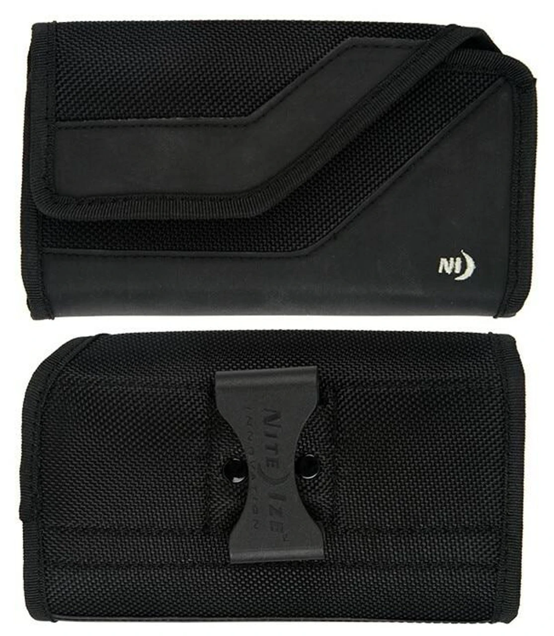 The Nite Ize Clip Case Sideways Universal Rugged Holster is designed to keep even the largest phone safe and at-hand on your belt, in a fixed horizontal position. Made of durable ballistic material to protect from impacts, and accented with weather-resistant, rugged hypalon material. Your phone stays secure with a durable hook and loop lid closure, and an interior pocket provides a handy place to store ID, credit cards, or cash. Perfect for rugged work or play environments of nearly every kind.