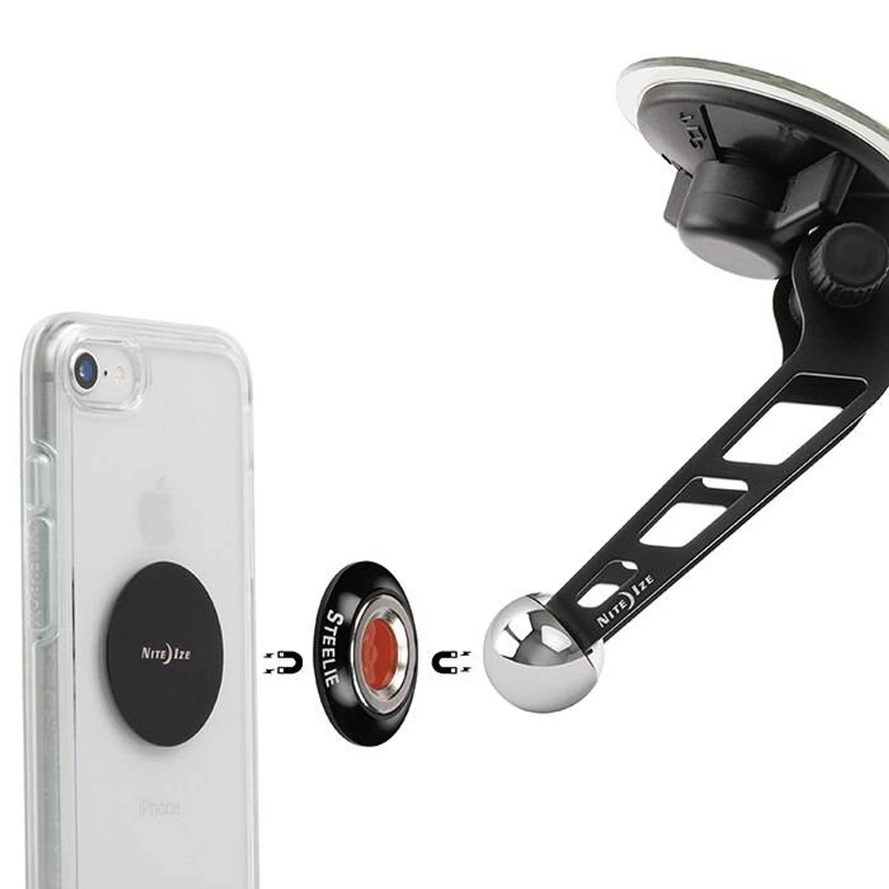 The Nite Ize Steelie Orbiter Windshield Kit combines the portable Windshield Mount with the powerful Orbiter Magnetic Socket to keep your phone secure and conveniently accessible. The Windshield Mount features an adjustable aluminum arm and suspended Steelie ball, which can be adjusted for the perfect viewing angle. The patented suction cup design features an easy-to-use locking lever for ultimate holding power to your windshield. It also acts as a quick release lever when you want to remove it, making it perfect for multiple cars or to take with you while traveling. The Orbiter Magnetic Socket attaches to the Windshield Mount using a powerful neodymium magnet and silicone center for a secure connection and smooth glide. By combining magnetic power and a thin high-friction ring designed to prevent slipping, the phone docking surface of the Orbiter Magnetic Socket holds your phone securely in place. Simply adhere the low-profile metal plate to your phone or case and you’re ready to quickly attach, detach, and rotate your phone for quick and easy handsfree viewing wherever you go.