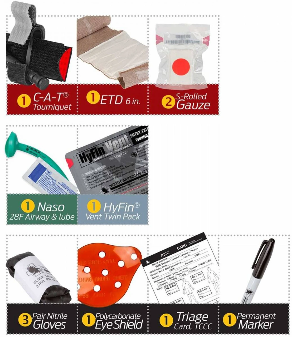 The North American Rescue Operator BLS / IFAK, IFAK is designed to equip the individual operator with the Basic Life Support tools needed for immediate Self-Aid, Buddy-Aid. This Improved First Aid Kit is configured penetrating injuries. The BLS IFAK can be worn in one of three methods; drop down leg rig, attaches to the assault vest, body armor with Molle-style connecters or attached directly to the duty belt.