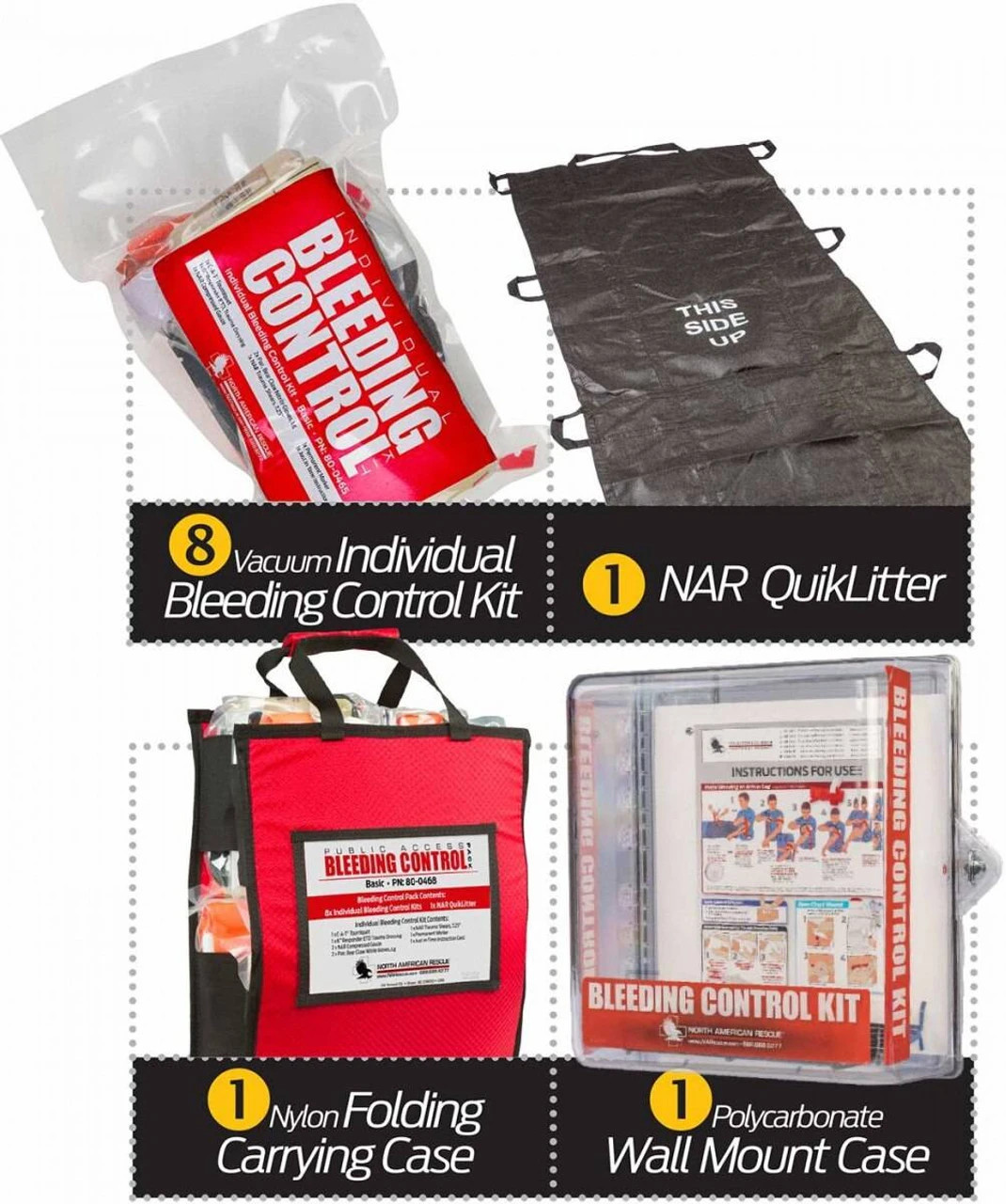 - Includes easy-to-open nylon carrying case containing eight (8) Individual Bleeding Control Kits packaged in ruggedized vacuum sealed pouches and one (1) NAR Responder QuikLitter for moving injured casualties