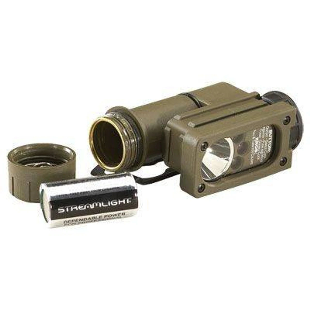 The Streamlight Sidewinder Compact is an ultra-compact, high performance, multi-source LED flashlight with the latest in LED technology. This flashlight has been engineered to meet a variety of hands free task illumination requirements with various color LEDs operable at varying outputs and runtimes. The flashlight features a 185 degree tilting head and belt or web clip to allow positioning of the illumination at the work area. Operates from a single CR123 lithium battery.Each LED features 4 levels of output intensities: Low (5%); Medium 1 (25%); Medium 2 (60%); High (100%) plus a Strobe function (100%). Pull-to-turn locking rotary selector knob prevents accidental mode changes and allows selection of 4 illumination sources: White C4 LED; IR LED; Red LED; Blue LED tactile indicator on rotary knob for IR LED position.